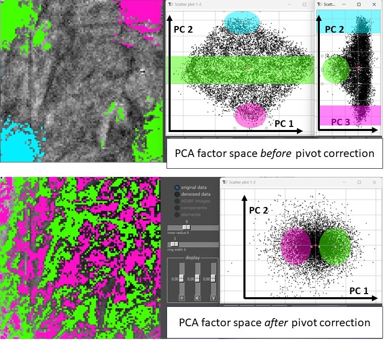 The recent development focused on 4D STEM treatment, namely on the pivot correction that improved a lot interpretability of PCA results.